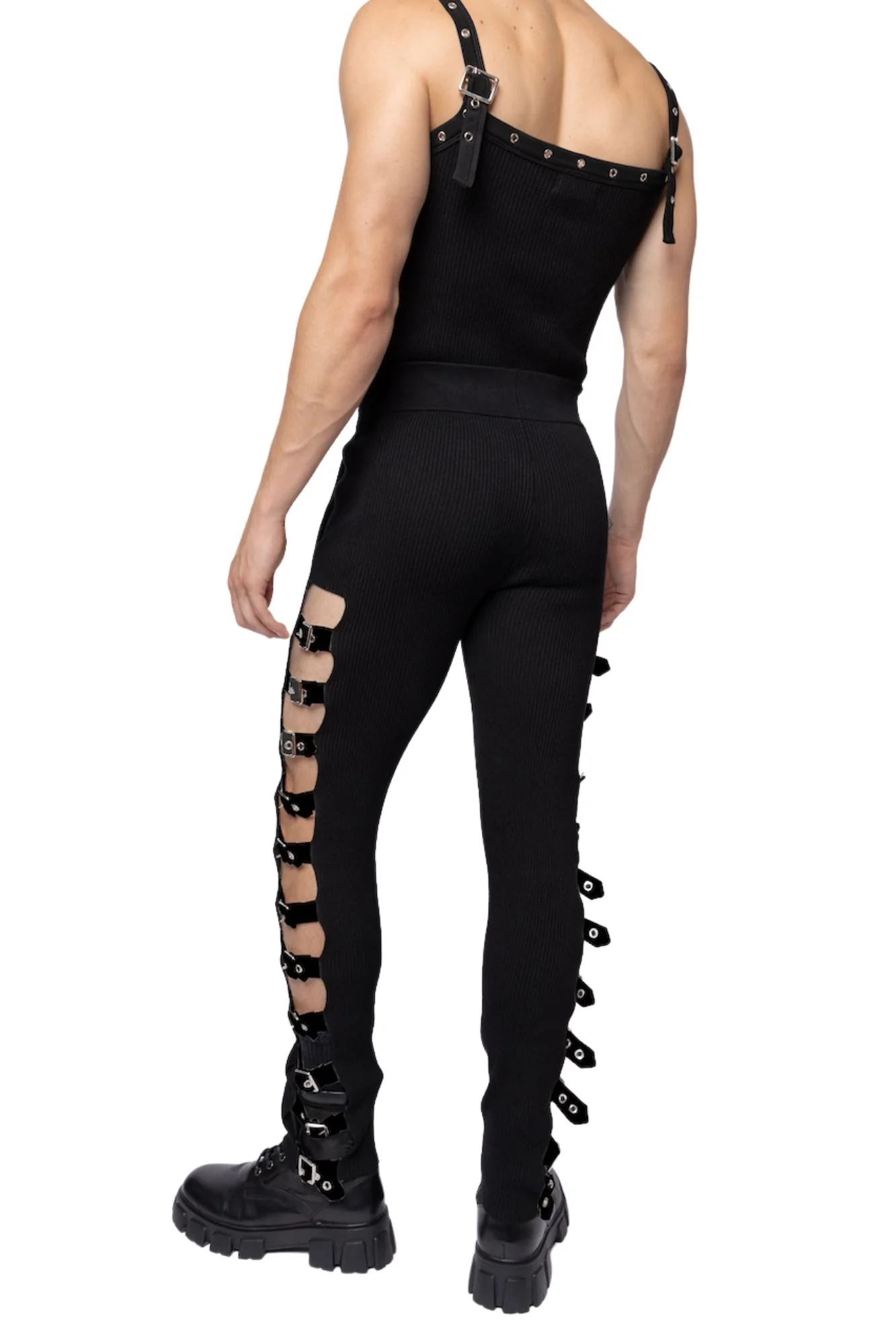 Mid to high-rise knitted pants crafted of a smoothing rib with an elastic waistline. Featuring eyelet buckle industrial hardware closures at the out seam, allowing adjustment for a more tailored and personalized fit and a sensual peekaboo effect.