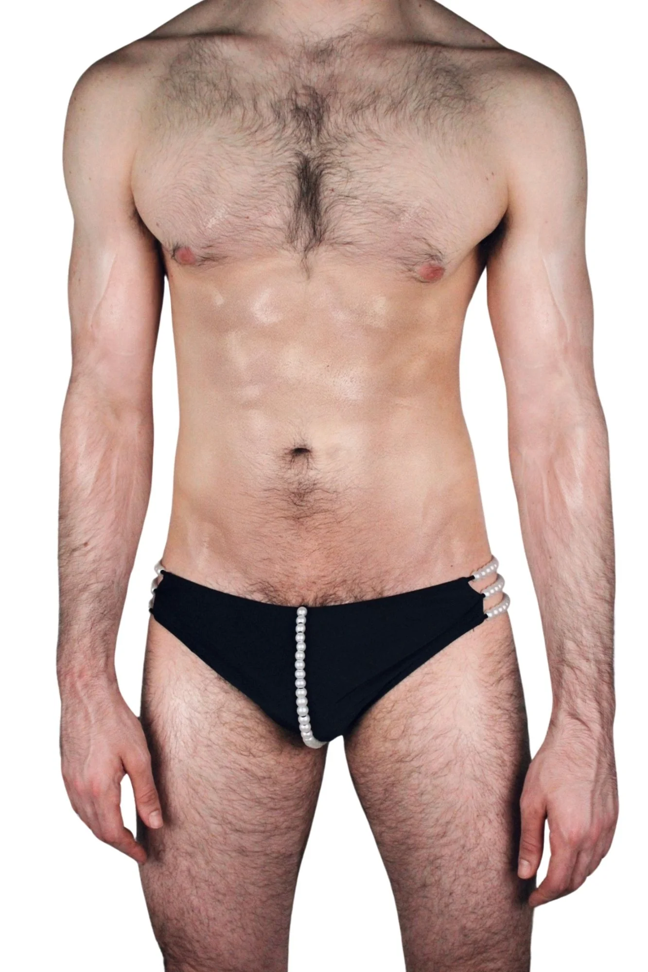 Lines of pearls on the sides strung the front and back panels together to form a pair of high-cut speedo. An additional strand of pearls trails through the entirety of center front and back to further echo the whimsical and sensual aesthetic. Cut-out on each side of the bathing suit creates fun pee-a-boo moments to show off your gams. Featuring our logo embroidery.