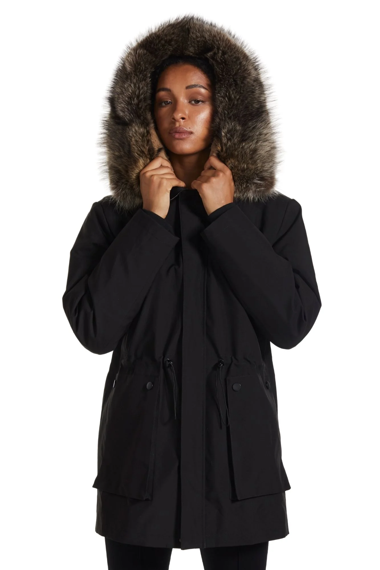 - Removable body lining in rabbit fur and padded sleeves and body filled with high-quality goose down